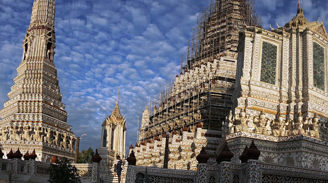 Aby zobaczyć te wszystkie wyżej wyświetlone na zdjęciach bogato zdobione świątynie niechętnie, ale cóż było robić – spod hotelu pojechaliśmy tuk – tukiem pod Pałac (aż 130 THB za 4 km - długo się targowaliśmy). Spore odległości trzeba było pokonać na piechotę, gdyż trwały jakieś uroczystości pogrzebowe (zmarł król Bhumibol Adulyadej) i spory obszar był zamknięty dla ruchu kołowego. Do Pałacu dotarliśmy na godzinę przed zamknięciem. By zwiedzić go i sensownie wykorzystać sporą kwotę za bilety na miejsce to należy przeznaczyć czas 2 godzin. Dlatego też zrezygnowaliśmy z tej atrakcji. W potwornym upale, resztką sił dotarliśmy pieszo do Wat Pho (jest po drugiej stronie Pałacu patrząc od głównego wejścia). Przepychając się przez tłumy ludzi i wzajemnie sobie przeszkadzając przy robieniu zdjęć leżącego Buddę obejrzeliśmy dość szybko. Potem zwiedzaliśmy pozostałe części świątyni. Wychodząc głównym wyjściem poszliśmy w kierunku Wat Arun Pier (obsługa świątyni była bardzo pomocna i wskazywała drogę) – przystani, z której wodnym tramwajem (starym rupciem) dostaliśmy się za 4 THB (dzieci tyle samo) w jedną stronę (powrót analogiczny) do Wat Arun pokonując rzekę Menam. Niestety ta świątynia była częściowo w remoncie, a rusztowania psuły widok misternie udekorowanych stup. Ale można było znaleźć wolne od szpecących rur miejsca i podziwiać jak promienie zachodzącego słońca skwapliwie wydobywały z nich majestatyczne piękno. Do hotelu wróciliśmy po nieco dłuższych negocjacjach z kierowcą tuk – tuka za te same pieniądze, za które tu przyjechaliśmy.